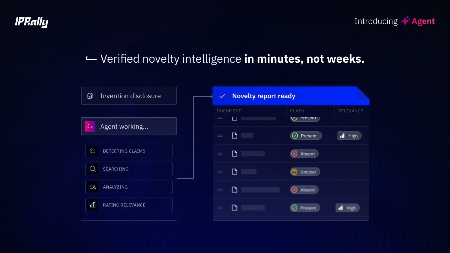 Today we're launching IPRally Agent, one of our most significant product releases to date. Agent automates the full novelty search workflow — from invention disclosure to structured, verifiable report — in minutes. Upload any combination of text, PDFs, images, or Office documents, and Agent identifies key claims and features, runs targeted searches across 120 million patents, and produces a feature chart, relevance-segmented results, and a written search report, with full transparency into every step of its reasoning. CPO and Co-founder Sakari Arvela outlines the thinking behind the release in this post.